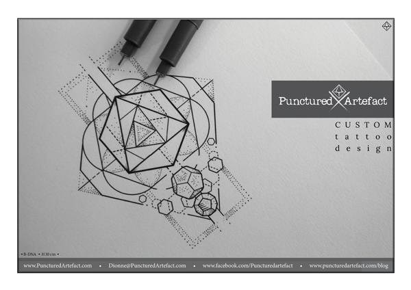 It features a dodecahedron (in 2 forms), molecular hexagons, seed of life, icosahedron. The design has 2 sections, which are both separated & joined.