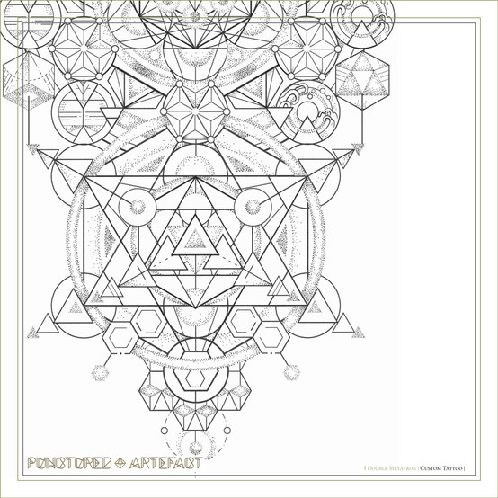It includes multiple Metatron inspired motifs. Alongside, Asanoha pattern, 4 Elements ( Water, Earth, Fire, Air) Arrows, 5 Platonic Solids, DNA shapes (e.g Hexagons)