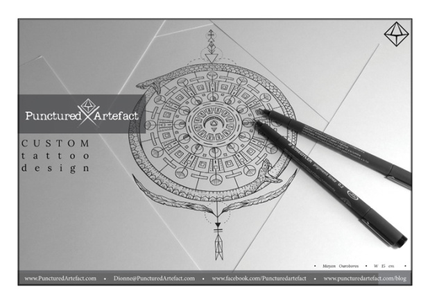 The design features a double ouroboros, with arrow, Quetzal feathers and a pattern based on the Mayan calendar in the centre.