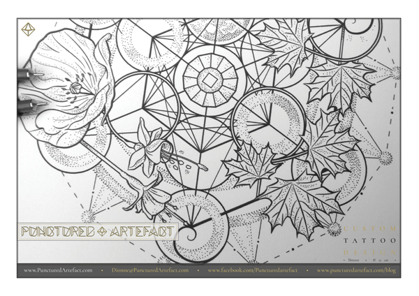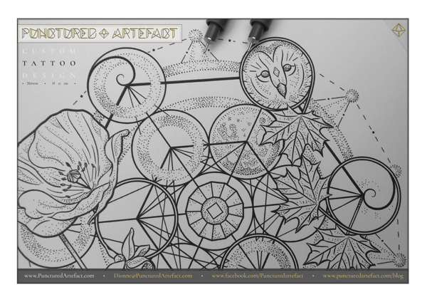 It features, a stylised Metatron’s cube as the base of the design. A barn owl face, tri spirals, flowers & leaves represent family members & home.