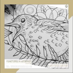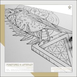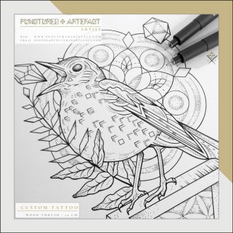 The design features a little wood thrush, perched on an impossible triangle. The patterns are created from Sacred Geometry (seed of life & flower of life) The design also features a fern leaf and a diamond, both symbolic to the client.