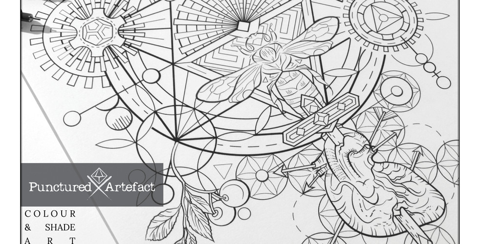 It features a mixture of painful and positive imagery. A bee (sting) heart & dagger, sacred geometry, hawthorn branches, buds & blossoms, little cogs & sun & stars.